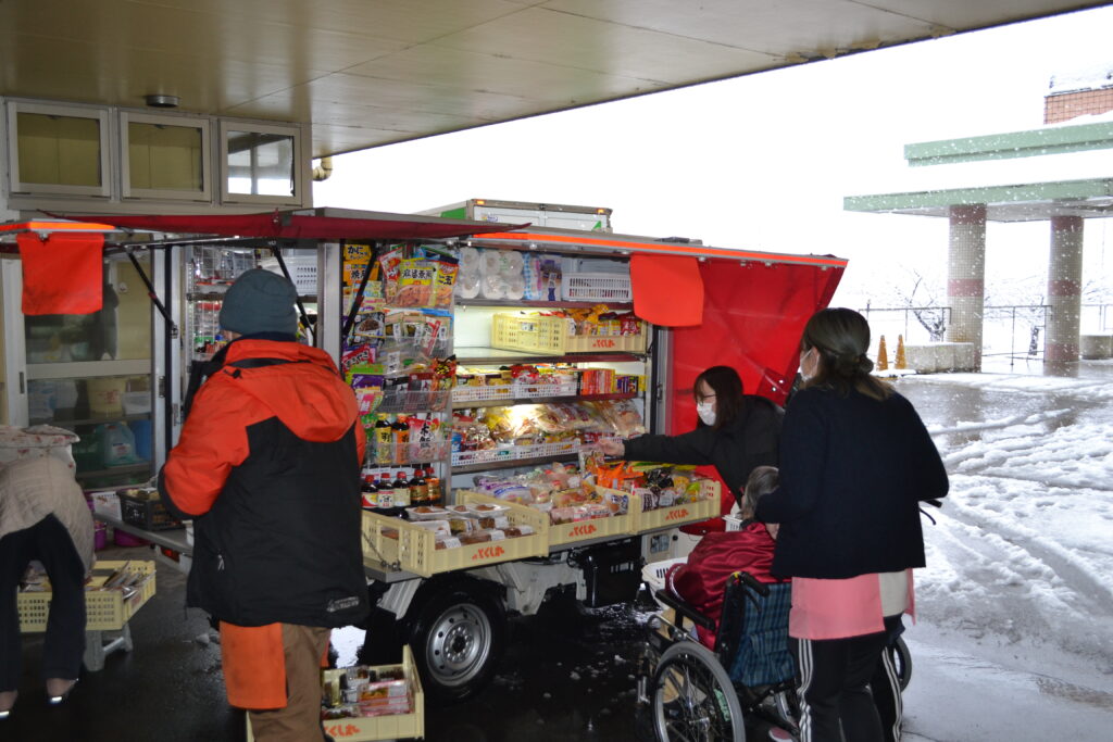 1月8日、今年最初の移動販売車「とくし丸」が寿楽苑に来ました。雪の降る寒い天気でしたが、「欲しい物買う時は寒いが関係ないよ。」と皆さんは笑って思い思いの品を買い物カゴへ。