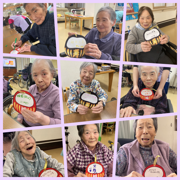 1月6日、1セク広場にて新年お楽しみ会を開催しました。職員が作成した達磨の絵馬に一人一人願い事を書いたり、福笑いをして笑ったりしました。