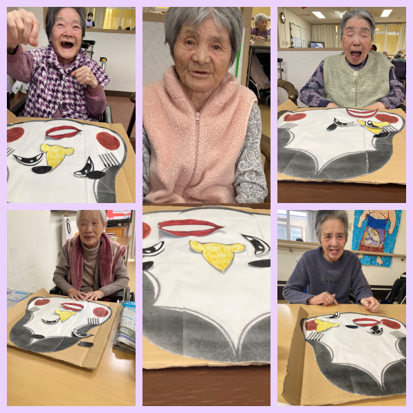 また福笑いでは「よし口はここや。」「私良いがにできるかな。」と話ながら顔をつくりました。完成すると、「ありゃりゃいいがにならんだ。面白い顔になったわ。」と笑顔が見られ、楽しい会になりました。
