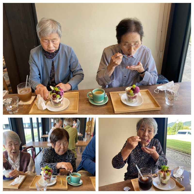 カフェ七星では皆さん、シャインマスカットのパフェやプリンにドリンクを添えて素敵な景色を見ながら「おいしいねぇ~」「猫展やって。写真とりたいなぁ~」でパチリと記念撮影。