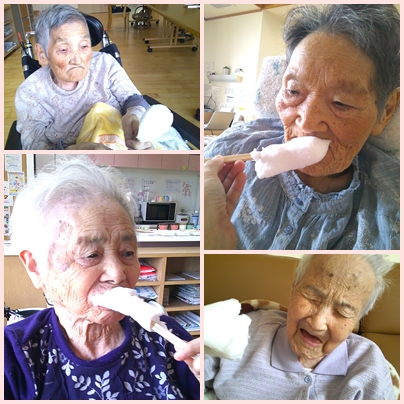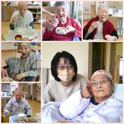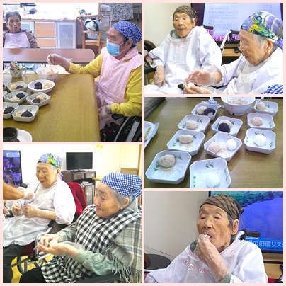 途中家族も来て、記念にパシャリ★午前中に作ったので、昼食にみんなでいただきました。おはぎを食べるのが少し苦手な方は、こしあんを少しずつ分けてご飯や粥と一緒にいただきました。ゼリー食の方は、こしあんなら大きな口を開けて食べてくれました。