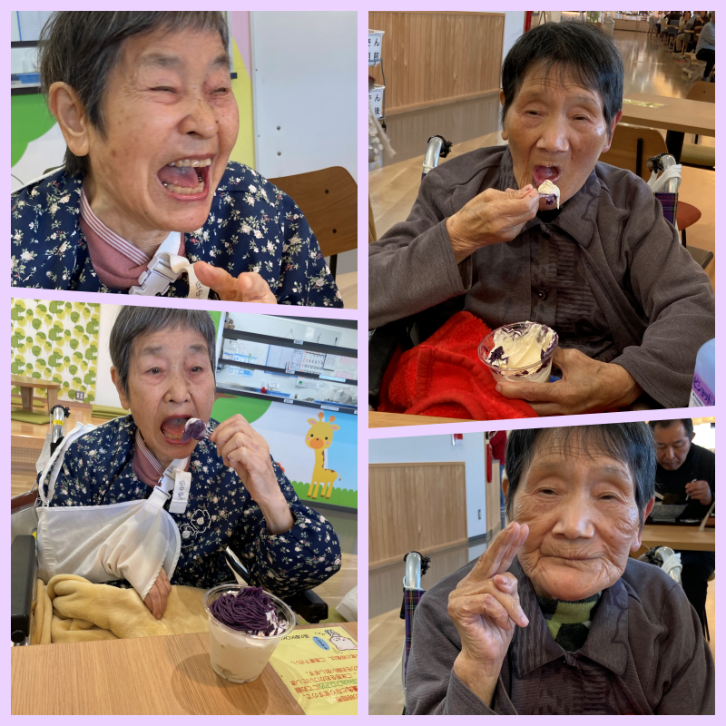 KOKO黒部に到着すると店内を回り、さつまいもを使用したおいモンブランソフトを食べました。「秋らしくて美味しいね」「まだ食べたいな」「お腹いっぱい!」「また来たいわ」と大満足でした。