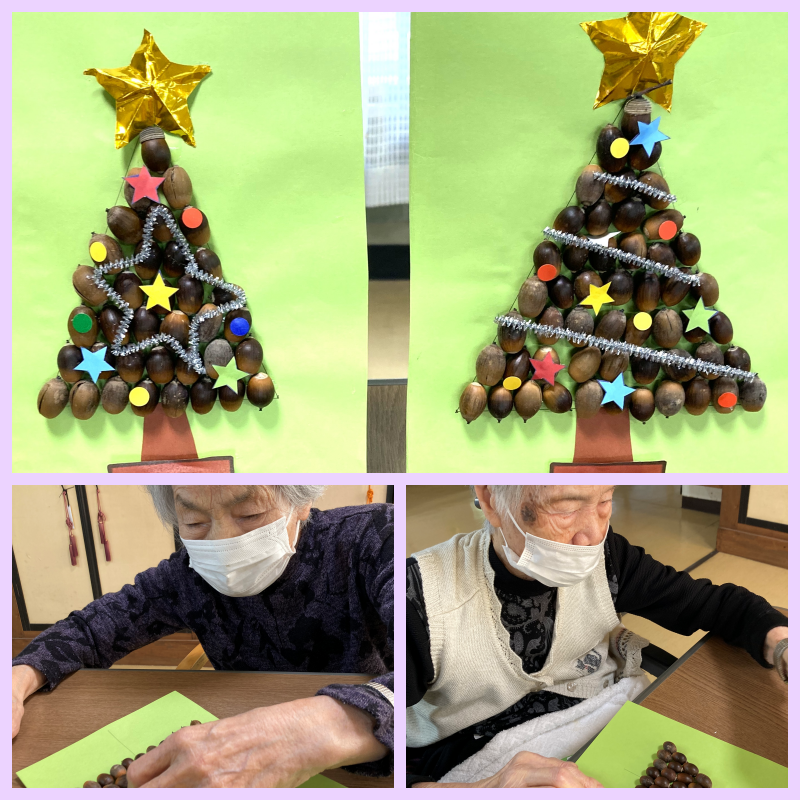 工作では、色画用紙にどんぐりを貼り付け、クリスマスツリーを作りました。「どんぐり昔いっぱい拾ったよ」「どんぐり久しぶりに見たわ」と懐かしそうに語られていました。